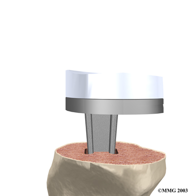 The plastic spacer is then attached to the metal tray of the tibial component. If this component should wear out while the rest of the artificial knee is sound, it can be replaced. The replacement procedure is called a retread.