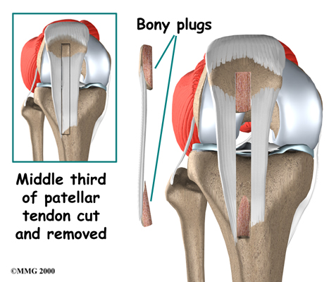 Before surgery you will be placed under either general anesthesia or a type of spinal anesthesia. The surgeon begins the operation by making two small openings into the knee, called portals. These portals are where the arthroscope and surgical tools are placed into the knee. Care is taken to protect the nearby nerves and blood vessels. A small incision is also made below the patella. Working through this incision, the surgeon takes out the middle section of the patellar tendon, along with the bone attachments on each end. The bone plugs are rounded and smoothed. Holes are drilled in each bone plug to place sutures (strong stitches) that will pull the graft into place. Bone Plugs