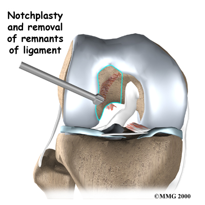 Next, the surgeon prepares the knee to place the graft. The remnants of the original ligament are removed. The intercondylar notch (mentioned earlier) is enlarged so that nothing will rub on the graft. This part of the surgery is referred to as a: Notchplasty