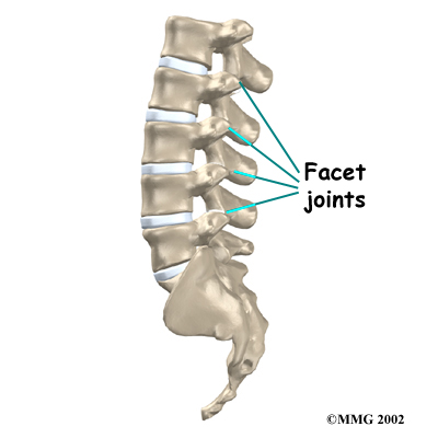Between the vertebrae of each spinal segment are two . The facet joints are located on the back of the spinal column. There are two facet joints between each pair of vertebrae, one on each side of the spine. A facet joint is made of small, bony knobs that line up along the back of the spine. Where these knobs meet, they form a joint that connects the two vertebrae. The alignment of the facet joints of the lumbar spine allows freedom of movement as you bend forward and back.