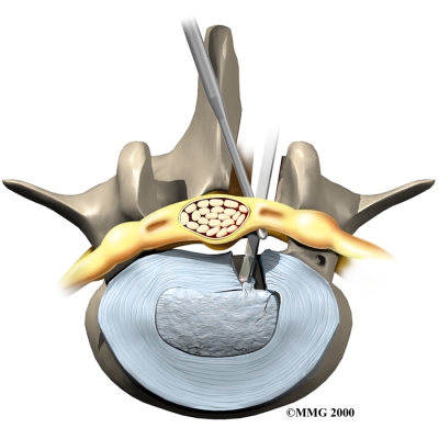 Surgery to take out part or all of a problem disc in the low back is called . Discectomy is done when the degenerated disc has ruptured (herniated) into the spinal canal, putting pressure on the spinal nerves. Surgeons commonly perform this operation through an incision in the low back. Before the disc material can be removed, the surgeon must first remove part of the lamina. Generally, only a small piece of the lamina is chipped away to expose the problem disc. This is called laminotomy. It usually creates enough room for the surgeon to remove the disc. If more room is needed, the surgeon may need to take out a larger section of the lamina by doing a laminectomy (described above).