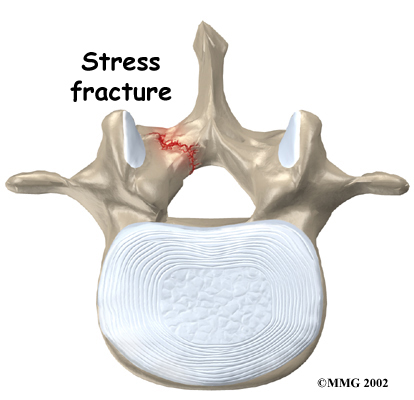 The vertebra initially responds to the abnormal strain by adding new bone cells around the injured area. But if the injuries happen faster than the body can keep up with needed repairs, a crack may form in the weakened bone. This is called a . This type of fracture occurs in the pars, the area of bony ring between the pedicle and lamina.