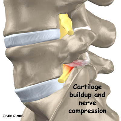 The cause of this nerve pressure is a result of the body's attempt to heal the stress fracture. Over time, the healing process may cause a bump of extra cartilage to grow at the site where the bones are trying to heal the overuse injury. If builds up, this bump may intrude into the opening where the nerves exit the spine. The bump may squeeze the nerve. This can produce pain and weakness in the leg. Reflexes become slowed. The person may also notice a pins and needles sensation in the skin where the spinal nerve travels.