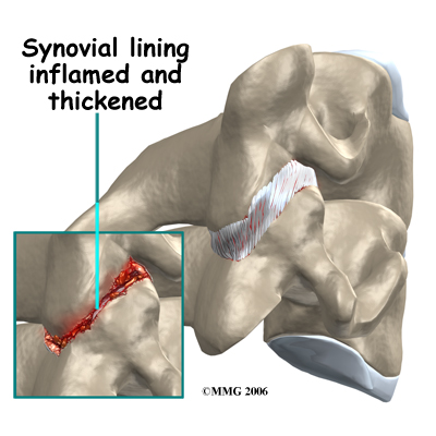 In RA, the synovial lining of the joint is affected. The normally thin tissue of the synovial lining becomes inflamed and thickened. This material begins to produce inflammatory chemicals that damage the articular cartilage and bone underneath. The joint is slowly destroyed until bone rubs against bone. In the spine, there are synovial joints between each vertebra and between the skull and the first cervical vertebra. With so many synovial joints in the spine, it is obvious why patients with RA often feel the disease there, and why it is categorized as a spondyloarthropathy.