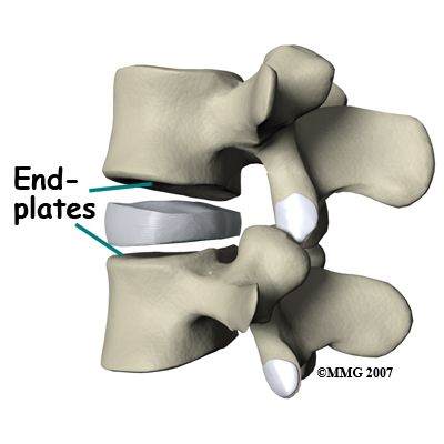 A plastic (polyethylene) core fits in between the two metal endplates. The core acts as a spacer and is shaped so that the endplates pivot in a way that imitates normal motion of the two vertebrae. There are small prongs or teeth on one side of each endplate. The teeth help anchor the endplate to the surface of the vertebral body.