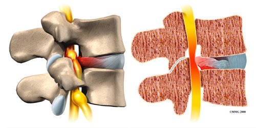 Lumbar laminectomy can alleviate the symptoms of spinal stenosis, a condition in which the spinal nerves become compressed inside the spinal canal. Wear and tear on the spine from aging and from repeated stresses and strains can cause a spinal disc to weaken. The outer rim of the disc bulges outward, and the disc may eventually protrude or even rupture into the spinal canal, . As a result, the nerves inside the canal are squeezed, leading to symptoms of spinal stenosis.