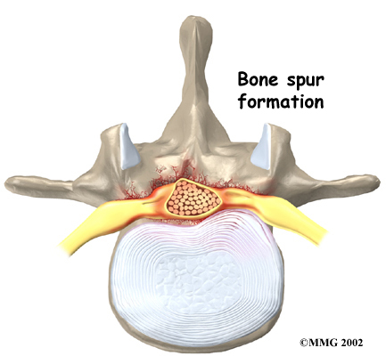 Degeneration also causes bone spurs to develop. These spurs commonly occur around the facet joints and along the edges of the vertebrae. When these spurs point into the spinal canal, they may squeeze against the spinal nerves. In a laminectomy, the surgeon removes a section of the lamina bone and any bone spurs, taking pressure off the spinal nerves. This enlarges the spinal canal so the spinal nerves have more room.