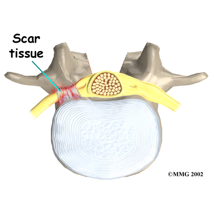 Any surgery that is done near the spinal canal can potentially cause injury to the spinal cord or spinal nerves. Injury can occur from bumping or cutting the nerve tissue with a surgical instrument, from swelling around the nerve, or from the formation of . An injury to the spinal cord or spinal nerves can cause muscle weakness and a loss of sensation to the areas supplied by the nerve.