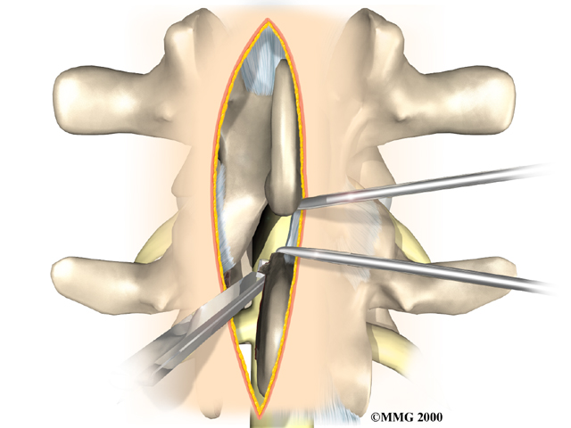 The surgeon first removes any pressure from nearby nerves. This may involve removing part or all of the lamina bone. (The lamina forms the back portion of the bony ring covering the spinal canal.) Then the surgeon takes out any disc fragments and scrapes off nearby bone spurs. In this way, the nerves inside the spinal canal are relieved of additional tension and pressure. The nerve roots are checked to see if they move freely in the spinal canal and as they leave the spine through the small holes between the vertebrae, the neural foramina. If not, the surgeon may cut a larger opening in the neural foramina. This procedure is called foraminotomy.