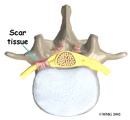 Any surgery that is done near the spinal canal can potentially cause injury to the spinal cord or spinal nerves. Injury can occur from bumping or cutting the nerve tissue with a surgical instrument, from swelling around the nerve, or from the formation of . An injury to these structures can cause muscle weakness and a loss of sensation to the areas supplied by the nerve.