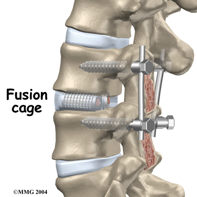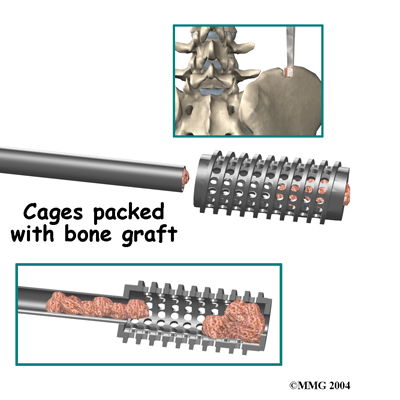 Once the disc is removed, the surgeon spreads the bones of the spine apart slightly to make room to implant bone graft material. Bone graft is commonly taken from the rim of the pelvis and packed in a special case, called a fusion cage. Bone taken from your own body is called autograft. Bone substitutes are also being used and avoid the need for taking bone from your pelvis.