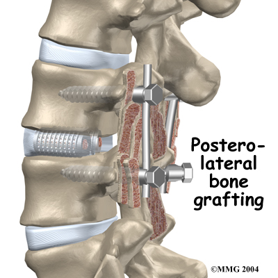 Some surgeons add strips of bone graft along the back of the vertebrae to be fused. This is called posterolateral fusion. The bones that project out from each side of the back of the spine are called transverse processes. The back surface of the transverse processes are shaved, causing the surfaces to bleed. Small strips of bone, usually taken from the pelvis bone at the beginning of the surgery, are placed over the transverse processes. The combination of this graft material with the pedicle screws helps hold the spine steady as the interbody fusion heals.