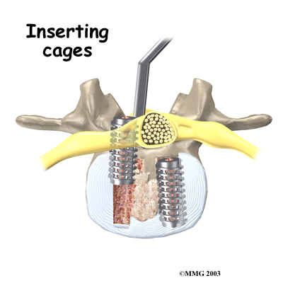 With the disc space held apart by the spreaders, the surgeon has enough room to place the bone graft between the two vertebral bodies. For the fusion cage method, the surgeon packs two cages with bone taken from the pelvis bone or with a suitable bone substitute. Two cages are inserted, one on the left and one on the right. When allograft bone wedges are used, the surgeon inserts the wedges and aligns them within the disc space.