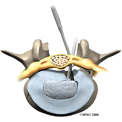 The nerve roots inside the spinal canal are then pulled aside with a retractor so the problem disc can be examined. With the nerves held to the side, the surgeon is able to see the disc where it sits just in front of the spinal canal.