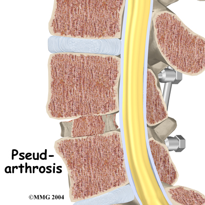 Sometimes the bones do not fuse as planned. This is called a nonunion, or pseudarthrosis. (The term pseudarthrosis means false joint.) When more than one level of the spine is fused at one time, there is a greater chance that nonunion will occur. (Fusion of more than one level means two or more consecutive discs are removed and replaced with bone graft.) If the joint motion from a nonunion continues to cause pain, the patient may need a second operation.