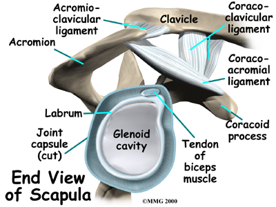 As the arm is raised, the rotator cuff also keeps the humerus tightly in the socket of the scapula, the glenoid. The upper part of the scapula that makes up the roof of the shoulder is called the acromion.