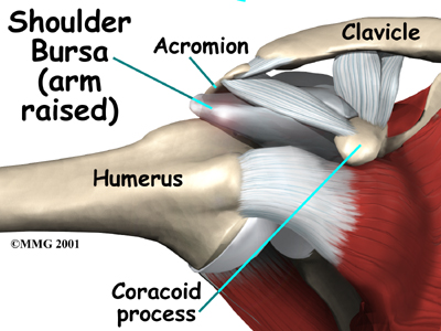 Many people refer to any pain in the shoulder as bursitis. The term bursitis really only means that the part of the shoulder called the bursa is inflamed. Tendonitis is when a tendon gets inflamed. This can be another source of pain in the shoulder. Many different problems can cause inflammation of the bursa or tendons. Impingement syndrome is one of those problems. Impingement syndrome occurs when the rotator cuff tendons rub against the roof of the shoulder, the acromion.