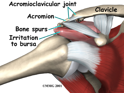 Bone spurs can reduce the space available for the bursa and tendons to move under the acromion. Bone spurs are bony points. They are commonly caused by wear and tear of the joint between the collarbone and the scapula, called the acromioclavicular (AC) joint. The AC joint is directly above the bursa and rotator cuff tendons.