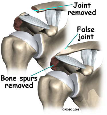 The most common procedure for AC joint osteoarthritis is resection arthroplasty. A resection arthroplasty involves removing a small portion of the end of the clavicle. This leaves a space between the acromion (the piece of the scapula that meets your shoulder) and the cut end of the clavicle, where the joint used to be. Your surgeon will take care not to remove too much of the end of the clavicle to prevent any damage to the ligaments holding the joint together. Usually only a small portion is removed, less than one cm (about three-eighths of an inch). As your body heals, the joint is replaced by scar tissue. Remember, the AC joint doesn't move much, but it does need to be flexible. The scar tissue allows movement but stops the bone ends from rubbing together.