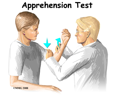 There are many clinical tests that can be performed to identify which soft tissue structures have been damaged or ruptured. A positive apprehension test is very diagnostic of an unstable shoulder that might dislocate anteriorly again after a first dislocation injury. For this test the arm is abducted and externally (outwardly) rotated by your Chiropractor. Just prior to the position where the joint is about to dislocate, you may become anxious as the feeling of a potential dislocation occurs. At that point, the test is considered positive for shoulder instability and therefore discontinued.