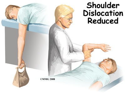One simple technique used by health care professionals to reduce an anterior shoulder dislocation is done in the prone (face down) position. The injured arm is supported at the edge of the table. The arm is allowed to dangle over the edge of the table with a weight attached. As the shoulder muscles relax, the humeral head passively (on its own) slips back to its normal position. Unfortunately this may take several minutes.