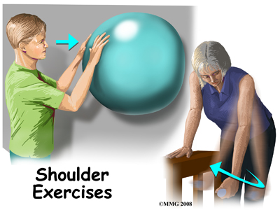 While you are immobilized simple finger movements, elbow and neck range of motion exercises should be performed. If your Chiropractor or doctor has stated that your shoulder is at risk of becoming stiff, pendular (Codman) exercises (with the immobilizer removed), will also be encouraged. Pendular exercises assist with pain relief, help to maintain some shoulder range of motion, and assist in preventing unwanted scar tissue forming in the joint. These exercises are performed by leaning forward or to the side, letting the arm hang clear of the chest, and then initiating movement with your trunk so that the dangling limb passively and gently moves. This action provides some traction to the glenohumeral joint, which aids in pain relief, and also assists the shoulder into a relative elevated motion (in relation to the trunk.) It is important that the pendular activity is done as passively as possible without initiating motion from the shoulder muscles. The exercise should be similar to a weighted pendulum that randomly swings on the end of a piece of string.