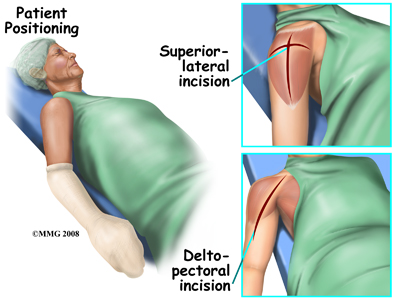 Shoulder replacement surgery is done through an incision on the front of your shoulder. This is called an anterior (deltopectoral) approach. For reverse shoulder replacements, especially for patients with multiple previous surgeries, a superior approach through the deltoid muscle may be used. No matter which approach is used, the surgeon cuts through the skin and then isolates the nerves and blood vessels and moves them to the side. The muscles are also moved to the side. If the deltoid requires cutting, a delay in your rehabilitation will be needed to allow the deltoid muscle to heal before putting stress through it.