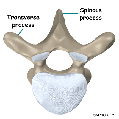 A bony knob projects out at the point where the two laminae join together at the back of the spine. You can feel these projections, called spinous processes, as you rub your fingers up and down the middle of your back. Bony knobs also project out from the side of the bony ring, one on the left and one on the right. These projections are called transverse processes. In the thoracic spine, all the ribs except the 11th and 12th ones attach onto these transverse processes as well as attaching onto the thoracic vertebral body. The 11th and 12th ribs connect only to the vertebral body and are therefore freer to move.