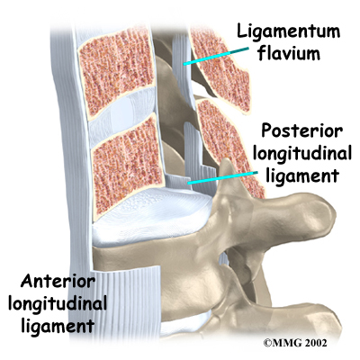 Connective tissue is a network of fiber that holds the cells of the body together. Ligaments are strong connective tissues that attach bones to other bones to hold them in place. Several long ligaments connect on the front and back sections of the vertebrae of the entire spine, including the thoracic spine. The anterior longitudinal ligament runs lengthwise down the front of the vertebral bodies. Two other ligaments run the full length within the spinal canal. The posterior longitudinal ligament attaches on the back of the vertebral bodies. The ligamentum flavum is a long and more elastic-like ligament that connects to the front surface of the lamina area of the vertebrae. Thick ligaments also connect the ribs to the transverse processes of the thoracic spine.