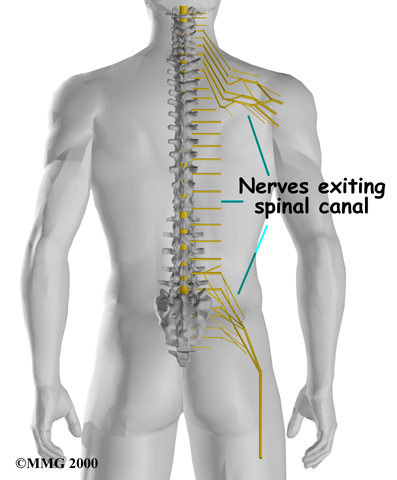 Between the vertebrae of the entire spine, including the thoracic spine, two large nerves branch off the spinal cord, one on the left and one on the right. The nerves pass through the neural foramina of each vertebra. These spinal nerves group together to form the main nerves that innervate the organs and limbs. The nerves originating from the thoracic spine mainly control the muscles and organs of the chest and abdomen.