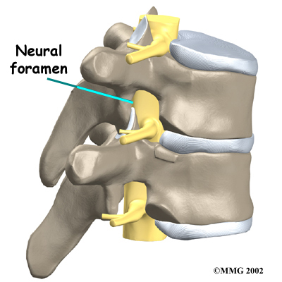 On the left and right side of each vertebra a small tunnel is formed from the stacking of vertebrae. This is called a neural foramen. (Foramina is the plural term.) The two nerves that leave the spine at each vertebra go through the foramina, one on the left and one on the right. The intervertebral disc (described later) sits directly in front of the opening. A bulged or herniated disc can encroach on the opening and put pressure on the nerve. A facet joint sits in the back of the foramen on each side.