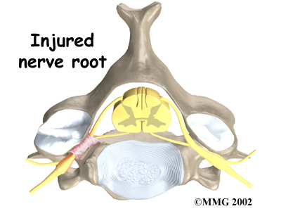 Wear and tear from repeated stresses and strains on the neck can cause a spinal disc to begin to collapse. As the space between the vertebral bodies shrinks, the opening around the nerve root narrows. This squeezes the nerve. The nerve root is further squeezed in the foramen when the facet joint lining the outer edge of the foramen becomes inflamed and enlarged as a result of the same degenerative changes.