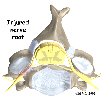 Any surgery that is done near the spinal canal can potentially cause . Injury can occur from bumping or cutting the nerve tissue with a surgical instrument, from swelling around the nerve, or from the formation of scar tissue. An injury to these structures can cause muscle weakness and a loss of sensation to the areas supplied by the nerve.