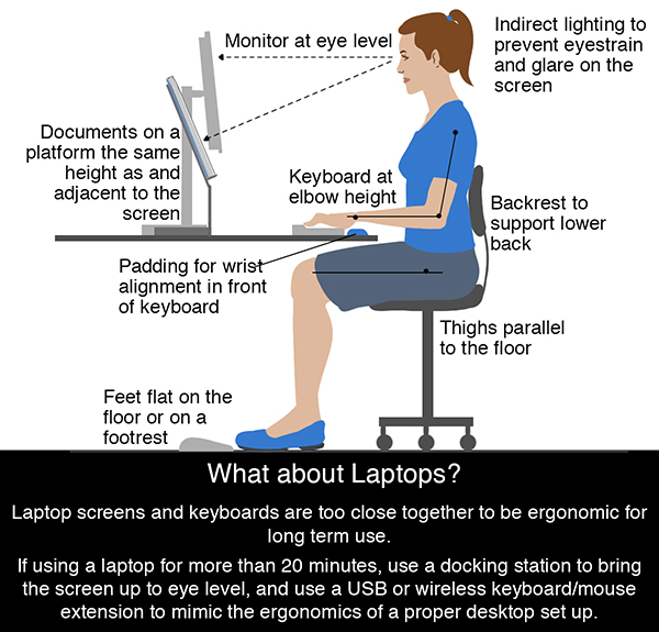 - Keep your eyes level within range of the top third of the screen. Don’t squint to see the screen (check for glare or enlarge the font);
